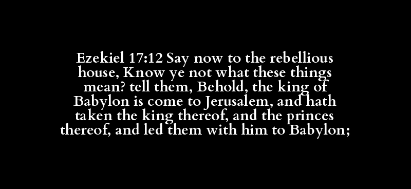 Ezekiel 17:12 Say now to the rebellious house, Know ye not what these things mean? tell them, Behold, the king of Babylon is come to Jerusalem, and hath taken the king thereof, and the princes thereof, and led them with him to Babylon;