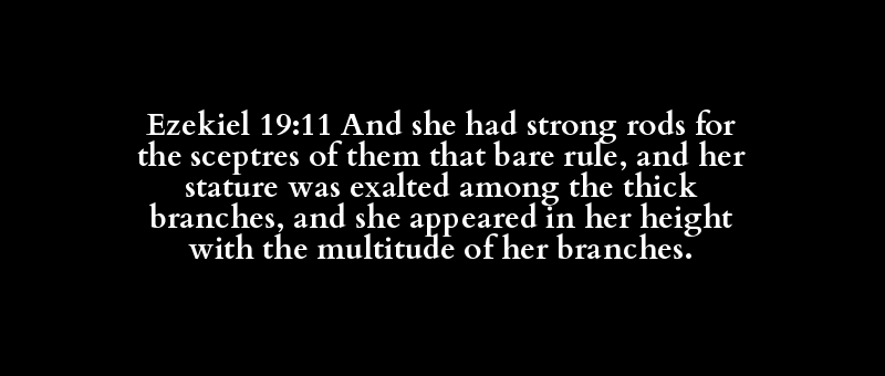 Ezekiel 19:11 And she had strong rods for the sceptres of them that bare rule, and her stature was exalted among the thick branches, and she appeared in her height with the multitude of her branches.