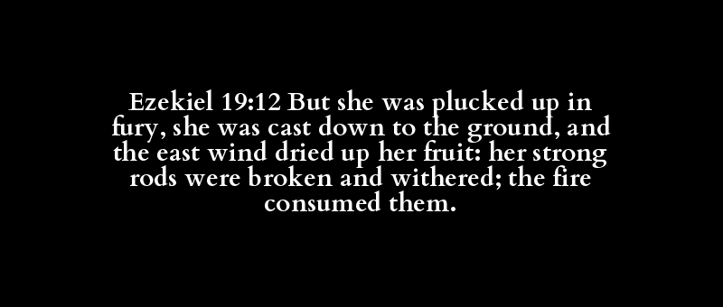 Ezekiel 19:12 But she was plucked up in fury, she was cast down to the ground, and the east wind dried up her fruit: her strong rods were broken and withered; the fire consumed them.