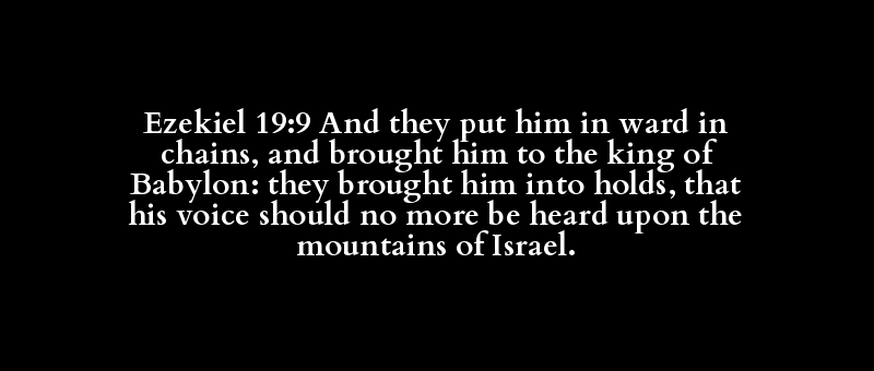 Ezekiel 19:9 And they put him in ward in chains, and brought him to the king of Babylon: they brought him into holds, that his voice should no more be heard upon the mountains of Israel.