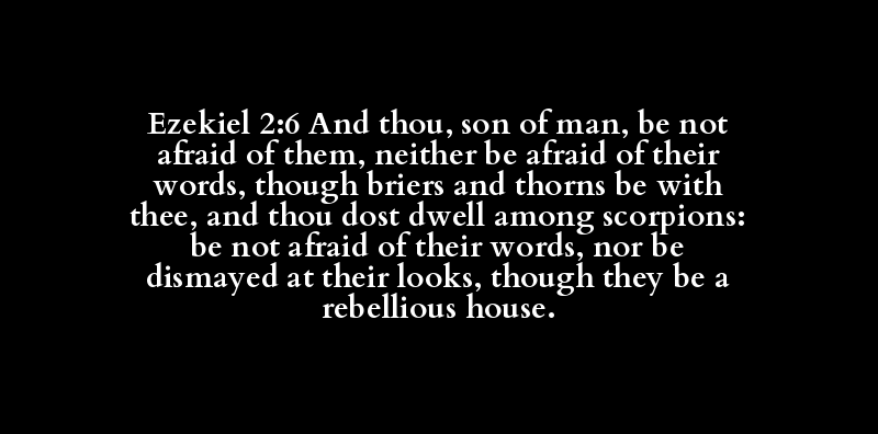 Ezekiel 2:6 And thou, son of man, be not afraid of them, neither be afraid of their words, though briers and thorns be with thee, and thou dost dwell among scorpions: be not afraid of their words, nor be dismayed at their looks, though they be a rebellious house.