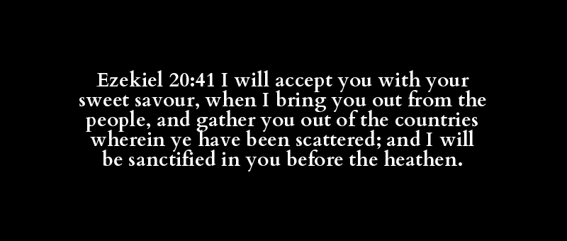 Ezekiel 20:41 I will accept you with your sweet savour, when I bring you out from the people, and gather you out of the countries wherein ye have been scattered; and I will be sanctified in you before the heathen.