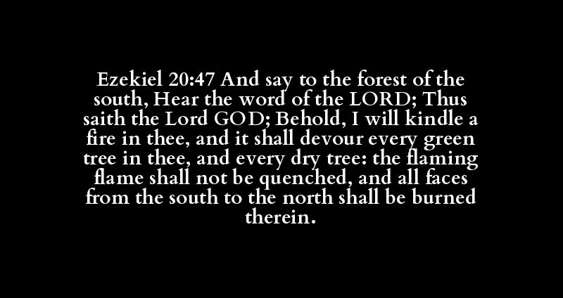 Ezekiel 20:47 And say to the forest of the south, Hear the word of the LORD; Thus saith the Lord GOD; Behold, I will kindle a fire in thee, and it shall devour every green tree in thee, and every dry tree: the flaming flame shall not be quenched, and all faces from the south to the north shall be burned therein.