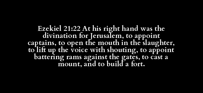 Ezekiel 21:22 At his right hand was the divination for Jerusalem, to appoint captains, to open the mouth in the slaughter, to lift up the voice with shouting, to appoint battering rams against the gates, to cast a mount, and to build a fort.