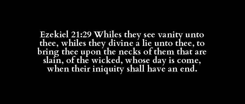 Ezekiel 21:29 Whiles they see vanity unto thee, whiles they divine a lie unto thee, to bring thee upon the necks of them that are slain, of the wicked, whose day is come, when their iniquity shall have an end.