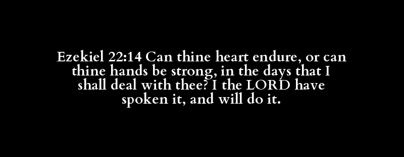 Ezekiel 22:14 Can thine heart endure, or can thine hands be strong, in the days that I shall deal with thee? I the LORD have spoken it, and will do it.