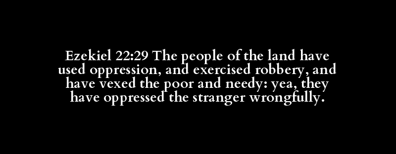 Ezekiel 22:29 The people of the land have used oppression, and exercised robbery, and have vexed the poor and needy: yea, they have oppressed the stranger wrongfully.