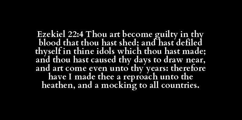 Ezekiel 22:4 Thou art become guilty in thy blood that thou hast shed; and hast defiled thyself in thine idols which thou hast made; and thou hast caused thy days to draw near, and art come even unto thy years: therefore have I made thee a reproach unto the heathen, and a mocking to all countries.