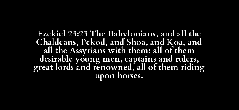 Ezekiel 23:23 The Babylonians, and all the Chaldeans, Pekod, and Shoa, and Koa, and all the Assyrians with them: all of them desirable young men, captains and rulers, great lords and renowned, all of them riding upon horses.