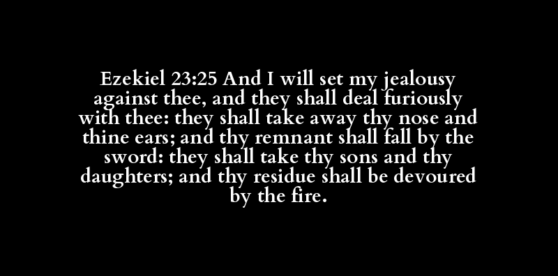 Ezekiel 23:25 And I will set my jealousy against thee, and they shall deal furiously with thee: they shall take away thy nose and thine ears; and thy remnant shall fall by the sword: they shall take thy sons and thy daughters; and thy residue shall be devoured by the fire.