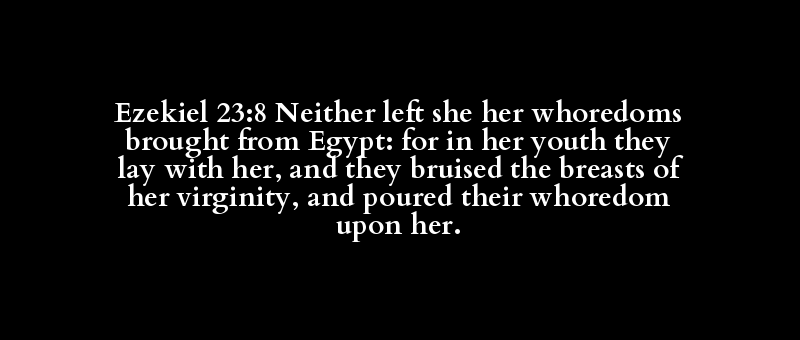 Ezekiel 23:8 Neither left she her whoredoms brought from Egypt: for in her youth they lay with her, and they bruised the breasts of her virginity, and poured their whoredom upon her.