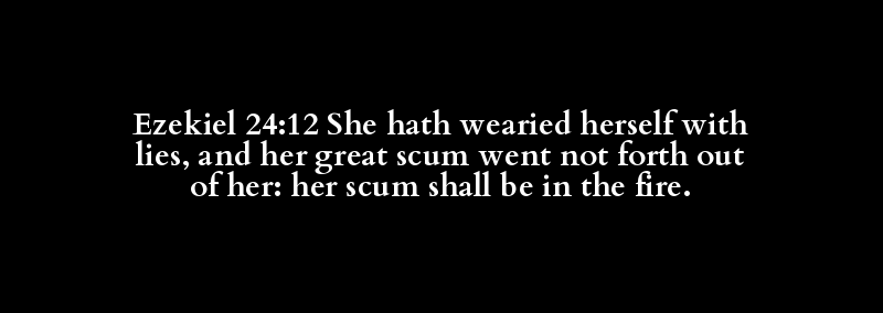 Ezekiel 24:12 She hath wearied herself with lies, and her great scum went not forth out of her: her scum shall be in the fire.