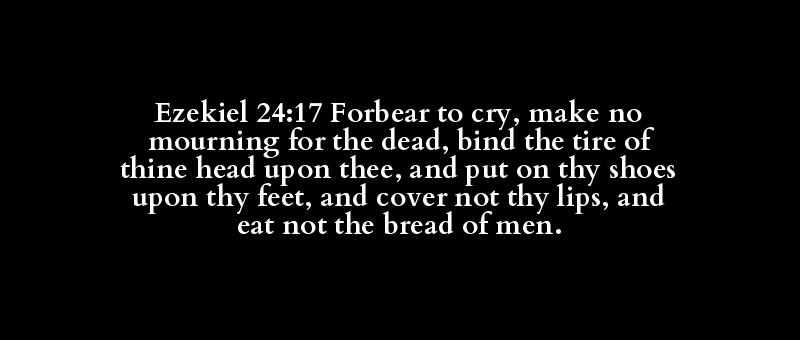 Ezekiel 24:17 Forbear to cry, make no mourning for the dead, bind the tire of thine head upon thee, and put on thy shoes upon thy feet, and cover not thy lips, and eat not the bread of men.