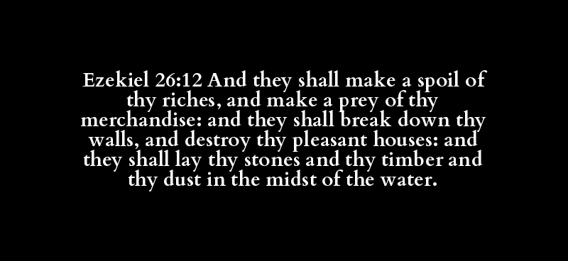 Ezekiel 26:12 And they shall make a spoil of thy riches, and make a prey of thy merchandise: and they shall break down thy walls, and destroy thy pleasant houses: and they shall lay thy stones and thy timber and thy dust in the midst of the water.
