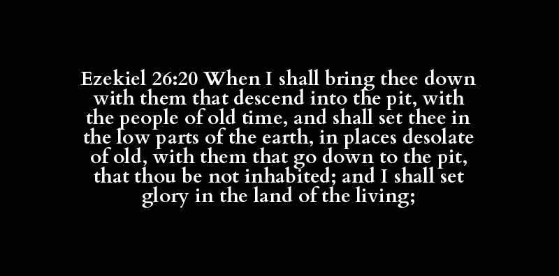 Ezekiel 26:20 When I shall bring thee down with them that descend into the pit, with the people of old time, and shall set thee in the low parts of the earth, in places desolate of old, with them that go down to the pit, that thou be not inhabited; and I shall set glory in the land of the living;