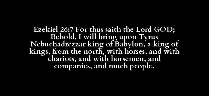 Ezekiel 26:7 For thus saith the Lord GOD; Behold, I will bring upon Tyrus Nebuchadrezzar king of Babylon, a king of kings, from the north, with horses, and with chariots, and with horsemen, and companies, and much people.