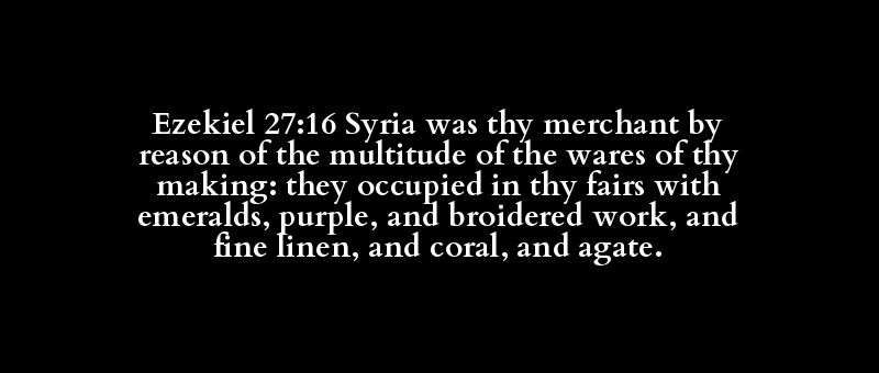 Ezekiel 27:16 Syria was thy merchant by reason of the multitude of the wares of thy making: they occupied in thy fairs with emeralds, purple, and broidered work, and fine linen, and coral, and agate.