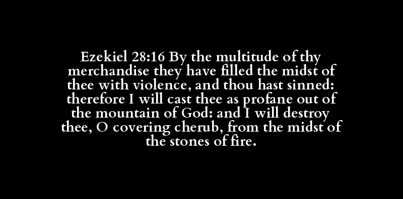Ezekiel 28:16 By the multitude of thy merchandise they have filled the midst of thee with violence, and thou hast sinned: therefore I will cast thee as profane out of the mountain of God: and I will destroy thee, O covering cherub, from the midst of the stones of fire.