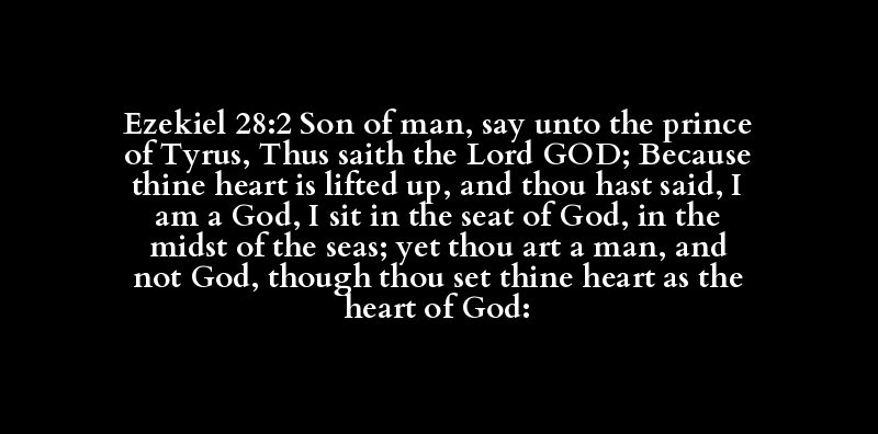 Ezekiel 28:2 Son of man, say unto the prince of Tyrus, Thus saith the Lord GOD; Because thine heart is lifted up, and thou hast said, I am a God, I sit in the seat of God, in the midst of the seas; yet thou art a man, and not God, though thou set thine heart as the heart of God: