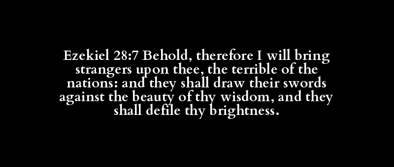 Ezekiel 28:7 Behold, therefore I will bring strangers upon thee, the terrible of the nations: and they shall draw their swords against the beauty of thy wisdom, and they shall defile thy brightness.