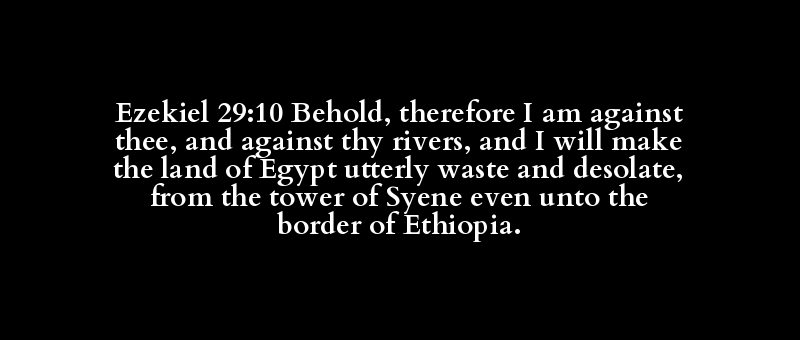 Ezekiel 29:10 Behold, therefore I am against thee, and against thy rivers, and I will make the land of Egypt utterly waste and desolate, from the tower of Syene even unto the border of Ethiopia.