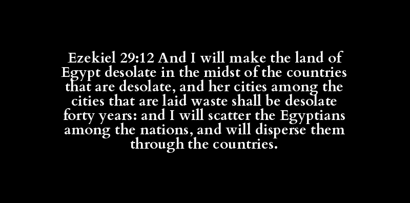Ezekiel 29:12 And I will make the land of Egypt desolate in the midst of the countries that are desolate, and her cities among the cities that are laid waste shall be desolate forty years: and I will scatter the Egyptians among the nations, and will disperse them through the countries.