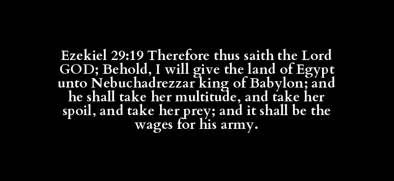 Ezekiel 29:19 Therefore thus saith the Lord GOD; Behold, I will give the land of Egypt unto Nebuchadrezzar king of Babylon; and he shall take her multitude, and take her spoil, and take her prey; and it shall be the wages for his army.