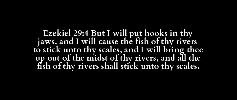 Ezekiel 29:4 But I will put hooks in thy jaws, and I will cause the fish of thy rivers to stick unto thy scales, and I will bring thee up out of the midst of thy rivers, and all the fish of thy rivers shall stick unto thy scales.