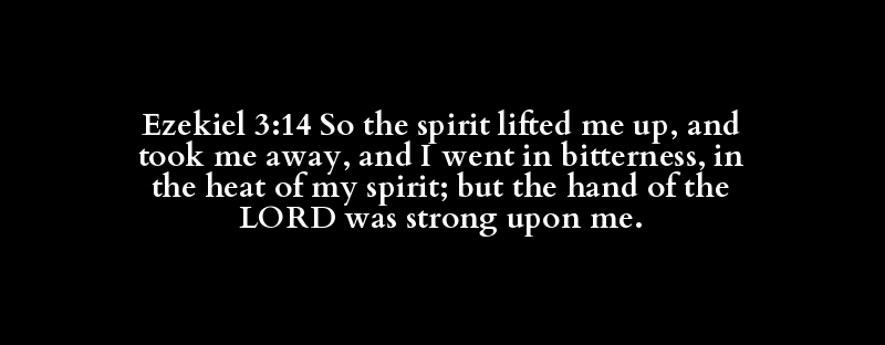 Ezekiel 3:14 So the spirit lifted me up, and took me away, and I went in bitterness, in the heat of my spirit; but the hand of the LORD was strong upon me.