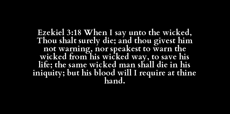 Ezekiel 3:18 When I say unto the wicked, Thou shalt surely die; and thou givest him not warning, nor speakest to warn the wicked from his wicked way, to save his life; the same wicked man shall die in his iniquity; but his blood will I require at thine hand.