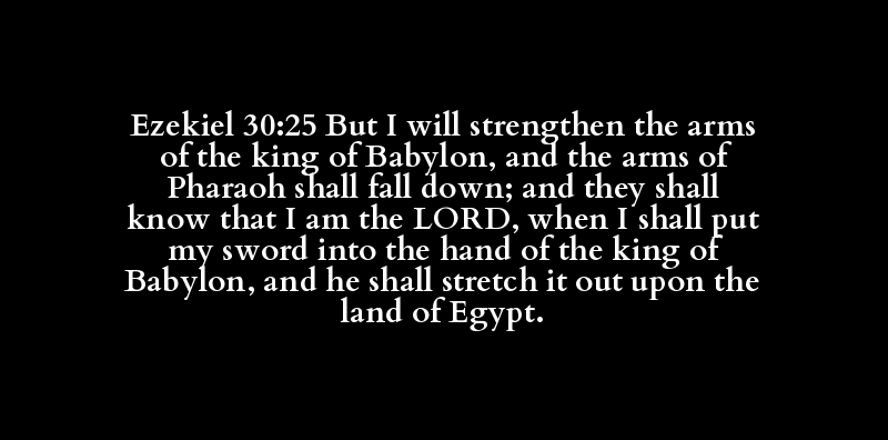 Ezekiel 30:25 But I will strengthen the arms of the king of Babylon, and the arms of Pharaoh shall fall down; and they shall know that I am the LORD, when I shall put my sword into the hand of the king of Babylon, and he shall stretch it out upon the land of Egypt.