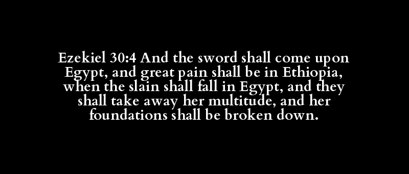 Ezekiel 30:4 And the sword shall come upon Egypt, and great pain shall be in Ethiopia, when the slain shall fall in Egypt, and they shall take away her multitude, and her foundations shall be broken down.