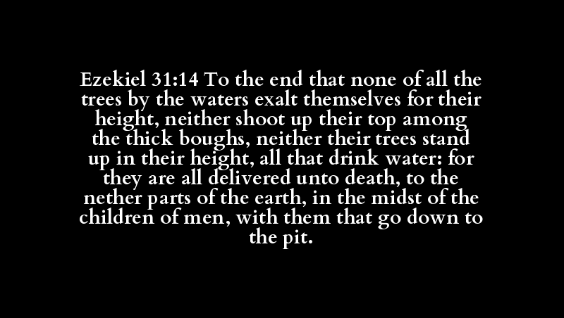 Ezekiel 31:14 To the end that none of all the trees by the waters exalt themselves for their height, neither shoot up their top among the thick boughs, neither their trees stand up in their height, all that drink water: for they are all delivered unto death, to the nether parts of the earth, in the midst of the children of men, with them that go down to the pit.