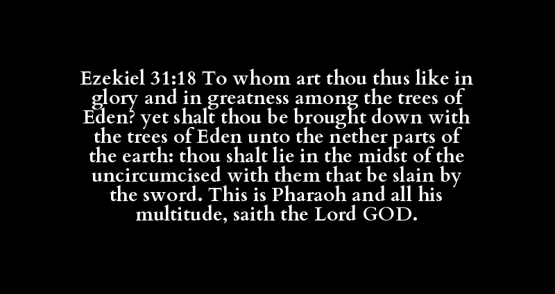 | דָּמָה | כָּבוֹד | גֹּדֶל | עֵץ | עֵדֶן | יָרַד | עֵץ | עֵדֶן | תַּחְתִּי | אֶרֶץ | שָׁכַב | תָּוֶךְ | עָרֵל | חָלָל | חֶרֶב | פַּרְעֹה | הָמוֹן | נְאֻם | אֲדֹנָי | יְהֹוִה |