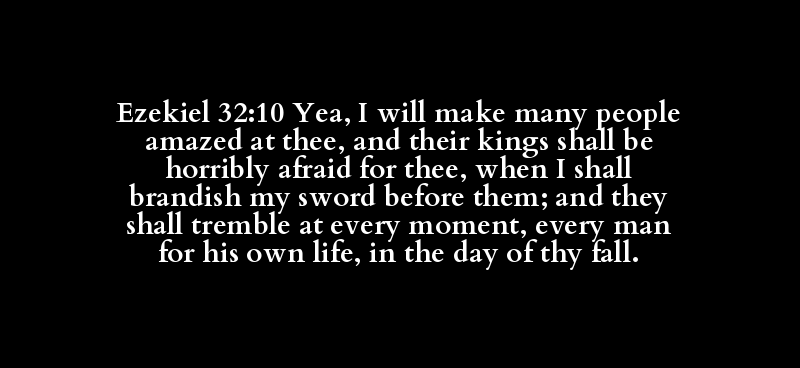 Ezekiel 32:10 Yea, I will make many people amazed at thee, and their kings shall be horribly afraid for thee, when I shall brandish my sword before them; and they shall tremble at every moment, every man for his own life, in the day of thy fall.