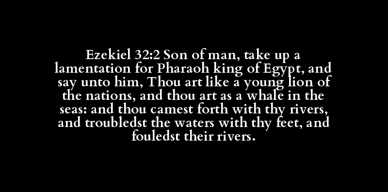 Ezekiel 32:2 Son of man, take up a lamentation for Pharaoh king of Egypt, and say unto him, Thou art like a young lion of the nations, and thou art as a whale in the seas: and thou camest forth with thy rivers, and troubledst the waters with thy feet, and fouledst their rivers.