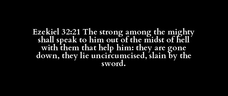 Ezekiel 32:21 The strong among the mighty shall speak to him out of the midst of hell with them that help him: they are gone down, they lie uncircumcised, slain by the sword.