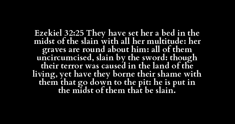 Ezekiel 32:25 They have set her a bed in the midst of the slain with all her multitude: her graves are round about him: all of them uncircumcised, slain by the sword: though their terror was caused in the land of the living, yet have they borne their shame with them that go down to the pit: he is put in the midst of them that be slain.
