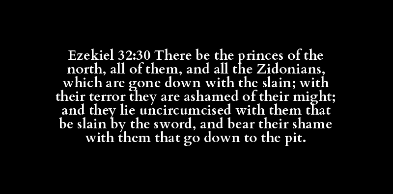 Ezekiel 32:30 There be the princes of the north, all of them, and all the Zidonians, which are gone down with the slain; with their terror they are ashamed of their might; and they lie uncircumcised with them that be slain by the sword, and bear their shame with them that go down to the pit.