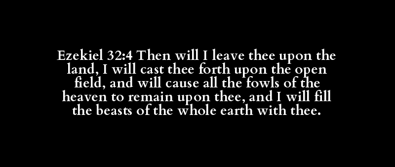Ezekiel 32:4 Then will I leave thee upon the land, I will cast thee forth upon the open field, and will cause all the fowls of the heaven to remain upon thee, and I will fill the beasts of the whole earth with thee.