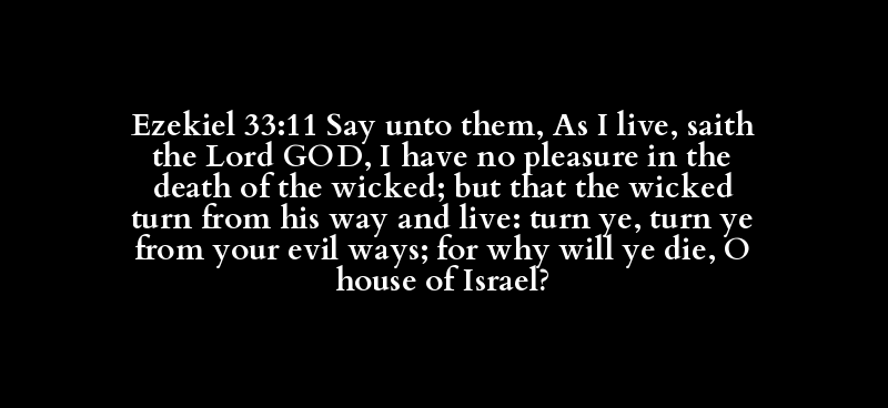 Ezekiel 33:11 Say unto them, As I live, saith the Lord GOD, I have no pleasure in the death of the wicked; but that the wicked turn from his way and live: turn ye, turn ye from your evil ways; for why will ye die, O house of Israel?