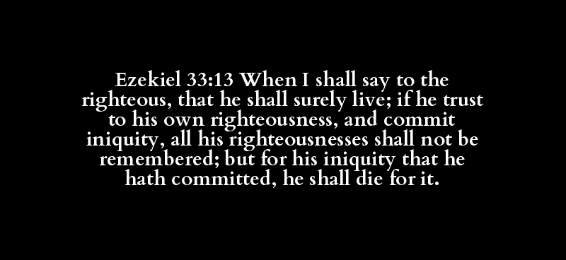 Ezekiel 33:13 When I shall say to the righteous, that he shall surely live; if he trust to his own righteousness, and commit iniquity, all his righteousnesses shall not be remembered; but for his iniquity that he hath committed, he shall die for it.
