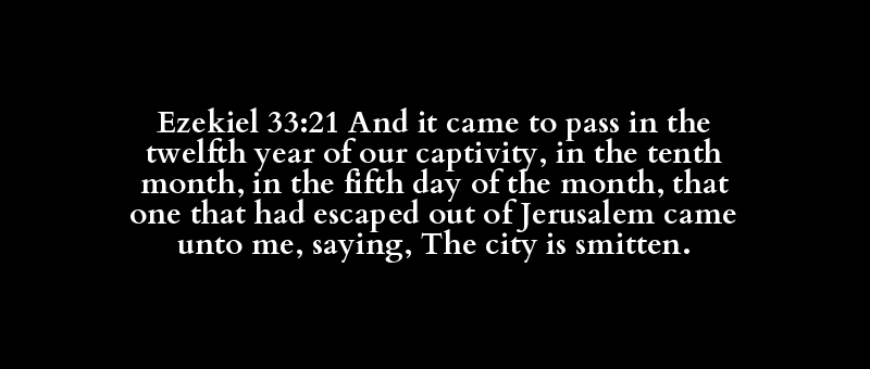 Ezekiel 33:21 And it came to pass in the twelfth year of our captivity, in the tenth month, in the fifth day of the month, that one that had escaped out of Jerusalem came unto me, saying, The city is smitten.