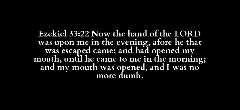 Ezekiel 33:22 Now the hand of the LORD was upon me in the evening, afore he that was escaped came; and had opened my mouth, until he came to me in the morning; and my mouth was opened, and I was no more dumb.