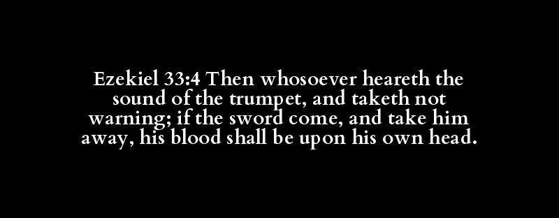 Ezekiel 33:4 Then whosoever heareth the sound of the trumpet, and taketh not warning; if the sword come, and take him away, his blood shall be upon his own head.