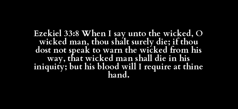 Ezekiel 33:8 When I say unto the wicked, O wicked man, thou shalt surely die; if thou dost not speak to warn the wicked from his way, that wicked man shall die in his iniquity; but his blood will I require at thine hand.