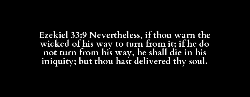 Ezekiel 33:9 Nevertheless, if thou warn the wicked of his way to turn from it; if he do not turn from his way, he shall die in his iniquity; but thou hast delivered thy soul.