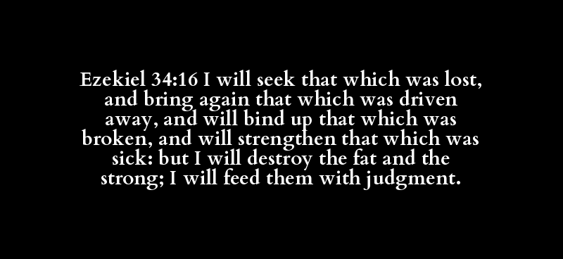 Ezekiel 34:16 I will seek that which was lost, and bring again that which was driven away, and will bind up that which was broken, and will strengthen that which was sick: but I will destroy the fat and the strong; I will feed them with judgment.