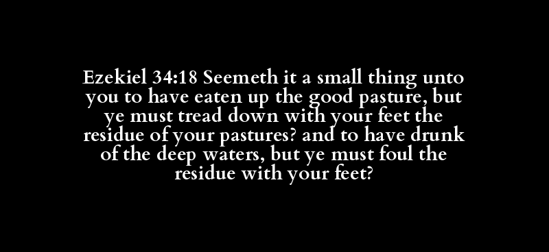 Ezekiel 34:18 Seemeth it a small thing unto you to have eaten up the good pasture, but ye must tread down with your feet the residue of your pastures? and to have drunk of the deep waters, but ye must foul the residue with your feet?
