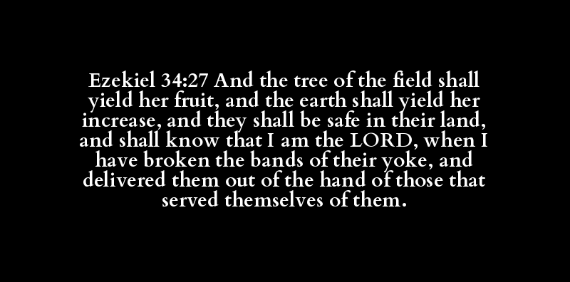 Ezekiel 34:27 And the tree of the field shall yield her fruit, and the earth shall yield her increase, and they shall be safe in their land, and shall know that I am the LORD, when I have broken the bands of their yoke, and delivered them out of the hand of those that served themselves of them.